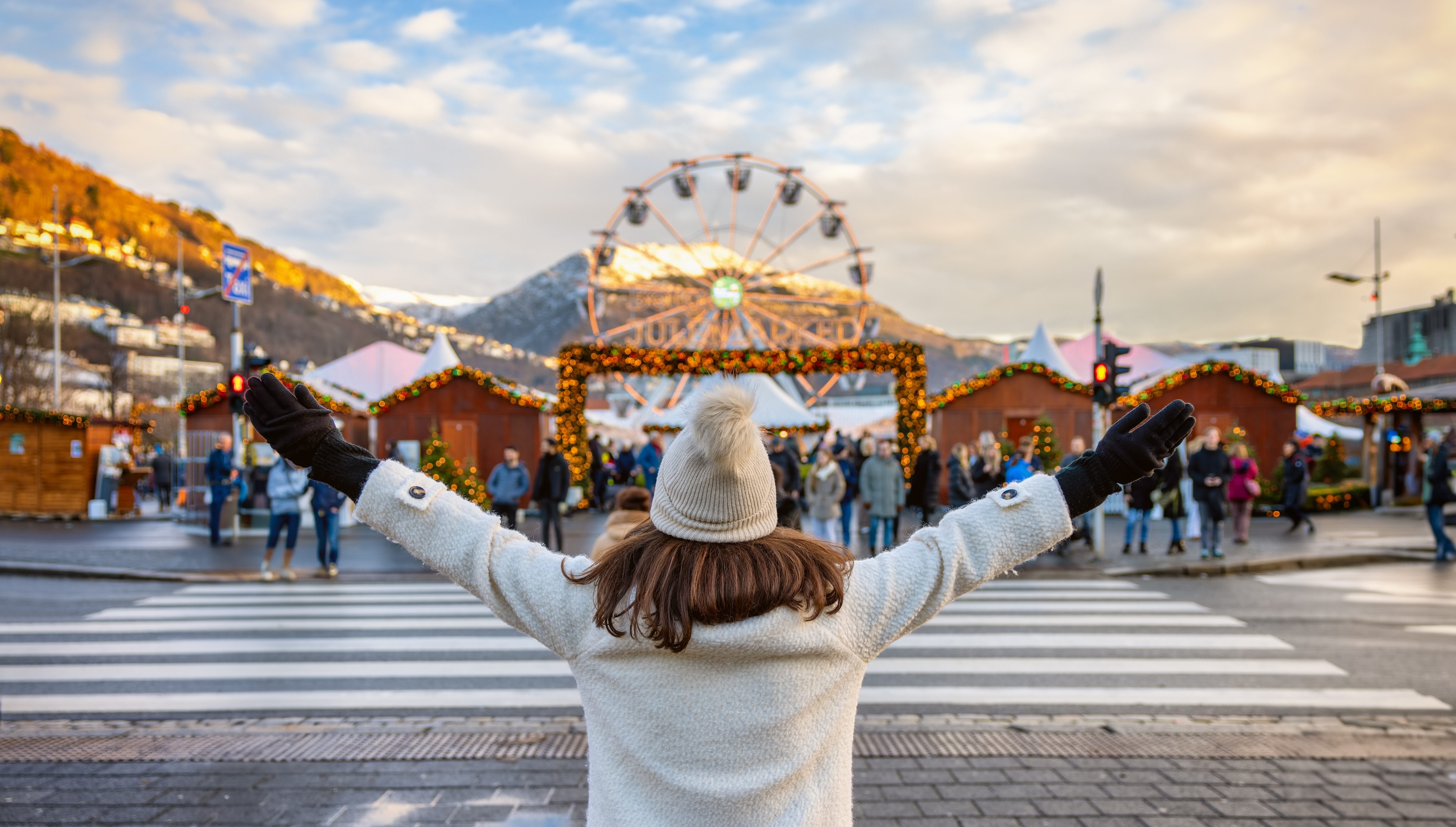A,Happy,Tourist,Woman,Stands,In,Front,Of,The,Christmas